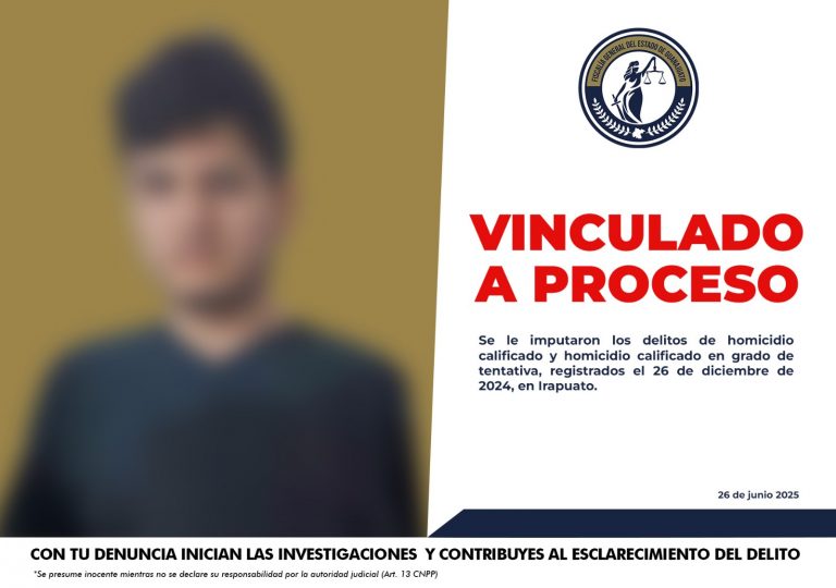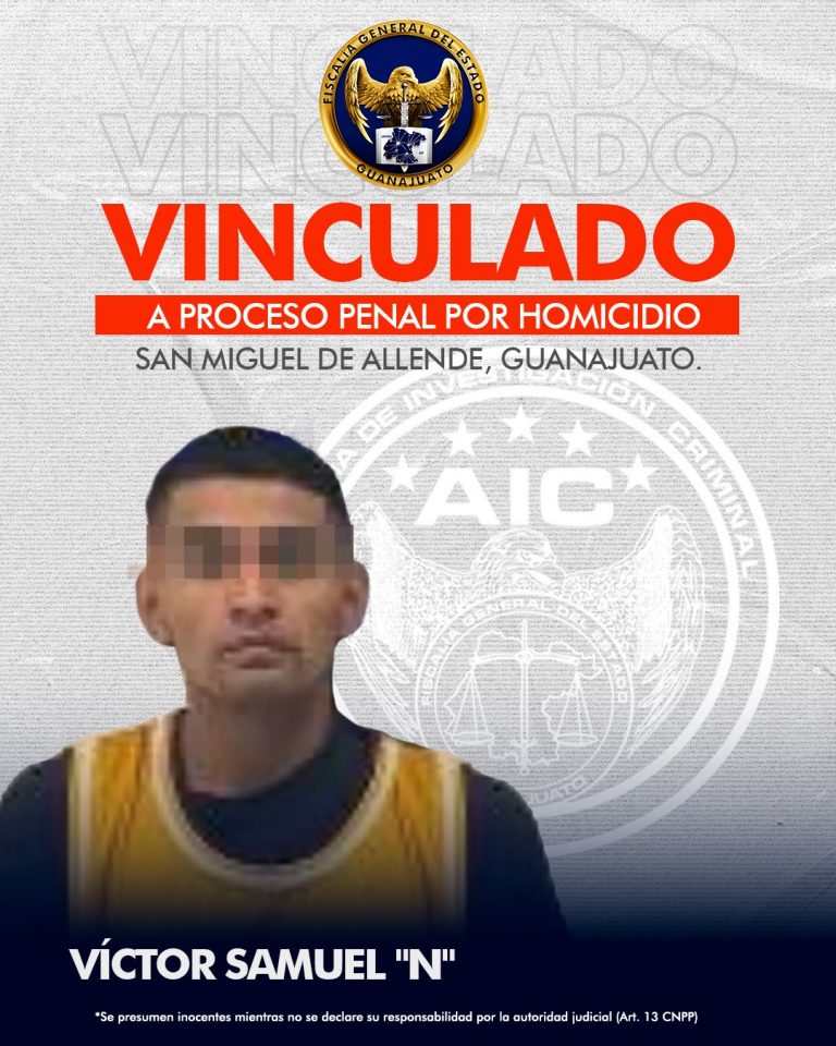 La Fiscalía General del Estado de Guanajuato, a través de la Unidad Especializada en Investigación de Homicidios de la Región D, capturó a JOSÉ MIGUEL “N”, alias “el pez”, como probable responsable de los delitos de homicidio y tentativa de homicidio; delitos por los que ha sido vinculado a proceso penal con prisión preventiva. Los hechos que se le imputan ocurrieron la noche del 28 de julio de 2025, entre las 23:00 y 23:30 horas, en la colonia Pedro Moreno de San Miguel de Allende. Según el sustento probatorio presentado por el Ministerio Público, las víctimas, entre ellas, dos menores de edad, arribaban a un domicilio a bordo de una camioneta cuando fueron interceptados por sujetos que viajaban en una motocicleta. Se tiene establecido que el imputado, accionó un arma de fuego en contra de las víctimas. Derivado de la agresión, una persona perdió la vida a consecuencia de heridas producidas por proyectiles disparados por arma de fuego. Por su parte otras tres víctimas resultaron con lesiones. Tras la audiencia, la Jueza de Control analizó las pruebas presentadas por esta representación social y determinó que existen elementos suficientes para iniciar un proceso penal por los delitos de homicidio y tentativa de homicidio, imponiendo como medida cautelar la prisión preventiva por el tiempo que dure el proceso. Asimismo, se estableció un plazo de dos meses para el cierre de la investigación complementaria.