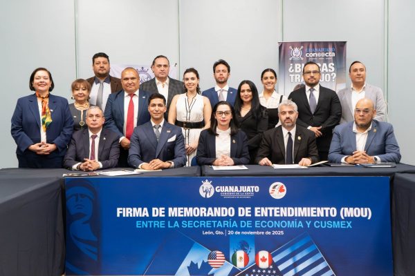 El convenio fortalece comercio e inversión en Guanajuato con América del Norte. El estado se posiciona como socio estratégico regional gracias a la formación de talento y proyectos estratégicos. León, Gto., 22 de noviembre del 2025.– El Gobierno de la Gente y el Consejo de Comercio Canadá–Estados Unidos–México (CUSMEX) firmaron un Memorando de Entendimiento con el objetivo de fortalecer la cooperación en materia de comercio, inversión, desarrollo de talento, innovación y fortalecimiento de las Pequeñas y Medianas Empresas (PYMES). La administración de la gobernadora, Libia Dennise García Muñoz Ledo, tiene el compromiso de tender puentes sólidos para impulsar a los diferentes actores económicos para un futuro más próspero y competitivo en el contexto global, facilitando la participación de las empresas locales en cadenas de valor trilaterales. La titular de la Secretaría de Economía, Claudia Cristina Villaseñor Aguilar, aseguró que con esta firma se institucionaliza una visión compartida basada en la cultura del esfuerzo, el trabajo duro y la resiliencia, valores que Guanajuato comparte con sus socios de América del Norte. “Juntos podremos marcar estrategias conjuntas para promover la integración de Guanajuato con América del Norte, facilitando la participación de nuestras empresas en cadenas trilaterales, así como la formación de un capital humano altamente capacitado mediante la Universidad CUSMEX”, dijo. El acuerdo busca promover la integración del estado con la región mediante estrategias conjuntas que posicionen a Guanajuato, líder en sectores como manufactura, automotriz-autopartes, aeroespacial y logística, como un socio estratégico fundamental. Un pilar central de esta colaboración será la formación de capital humano altamente capacitado a través de la Universidad CUSMEX para complementar los programas estatales como Capacitación en el Extranjero y Microcredenciales, formando talento listo para enfrentar los desafíos globales. Guanajuato ha demostrado su capacidad para integrarse a las cadenas productivas de Norteamérica, atrayendo 15 proyectos de inversión canadiense por 782 millones de dólares y 94 proyectos estadounidenses con una inversión superior a los 5 mil 300 millones de dólares, que en conjunto generan oportunidades para miles de familias guanajuatenses. Este Memorando de Entendimiento es el inicio de una cooperación profunda y duradera que fortalecerá los lazos económicos, culturales y sociales, reafirmando a Guanajuato como la plataforma ideal para la internacionalización, la generación de empleos de calidad y la innovación.
