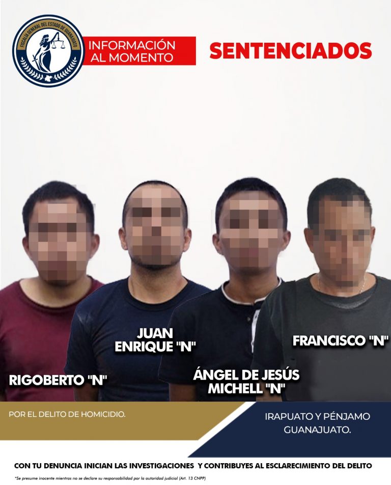 La Fiscalía General del Estado de Guanajuato informa que, derivado del trabajo de investigación científica y la integración de las carpetas de investigación con elementos sólidos, se lograron obtener sentencias condenatorias mediante procedimientos abreviados, en dos casos distintos de homicidio ocurridos en los municipios de Irapuato y Pénjamo. En el primer caso, se obtuvo una condena de nueve años de prisión en contra de RIGOBERTO “N”, ÁNGEL DE JESÚS MICHELL “N” y JUAN ENRIQUE “N”, responsables del homicidio de una persona en hechos registrados en la ciudad de Irapuato. Los sucesos ocurrieron el 30 de agosto de 2024, alrededor de las 00:28 horas, cuando los agresores descendieron de un vehículo para dirigirse hacia un hombre que se encontraba en el exterior de un inmueble ubicado sobre el bulevar Díaz Ordaz, en la colonia Barrio de San José. Tras golpearlo con la intención de subirlo al vehículo y no lograrlo, le dispararon con un arma de fuego, privándolo de la vida y huyendo del lugar. Una persecución policial permitió la detención inmediata de los tres responsables, asegurándole a uno de ellos un arma de fuego. Con las pruebas presentadas por el Ministerio Público y la aceptación de los cargos criminales por parte de los imputados, se dictó la sentencia ya señalada. En el segundo caso, la Fiscalía obtuvo sentencia condenatoria de nueve años de prisión en contra de FRANCISCO “N”, alias “el quirós”, responsable del homicidio de un hombre en la comunidad conocida como Los Gaona, en Pénjamo. El 12 de marzo de 2025, aproximadamente a las 13:50 horas, la víctima y el sentenciado se encontraban en un camino de terracería conocido como La Brecha, donde comenzaron a forcejear mientras sujetaban una carabina. En un momento determinado, FRANCISCO “N” despojó del arma al ofendido y fue entonces que el agresor lo golpeó repetidamente en la cabeza y rostro con la parte trasera de la carabina, dejándolo inconsciente. La víctima fue trasladada a recibir atención médica y permaneció hospitalizada hasta que perdió la vida a causa de un traumatismo craneoencefálico derivado de la agresión. En ambos casos, los responsables aceptaron su participación en los hechos, una vez que el Ministerio Público expuso las pruebas ante un Juez y esto permitió la aplicación del procedimiento abreviado para obtener sentencias firmes por el delito de homicidio.