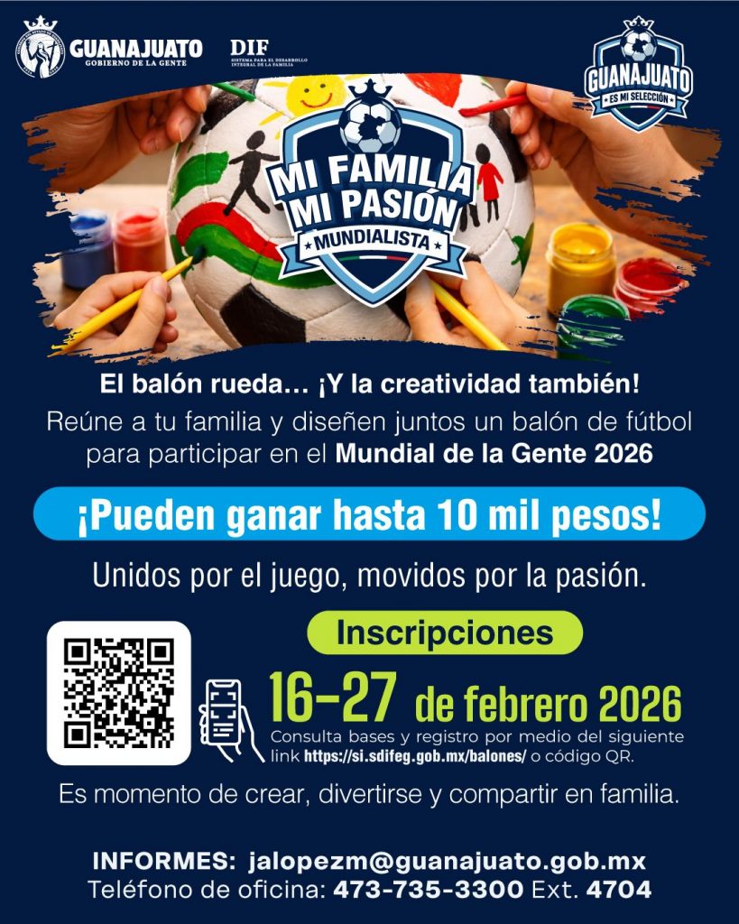 El viernes 27 de febrero cierran las inscripciones para participar en el concurso de decoración de balones, podrán ganar hasta 10 mil pesos. · El presidente del Consejo Consultivo, Juan Carlos Montesinos Carranza, exhortó a las familias guanajuatenses a no dejar pasar la oportunidad de fortalecer la unión familiar a través del arte y el trabajo en equipo. Guanajuato, Gto., a 24 de febrero del 2026.- La cuenta regresiva ya comenzó. Faltan pocos días para que cierre la convocatoria del concurso familiar de decoración de balones de fútbol Mi familia, mi pasión mundialista, y las familias de Guanajuato aún están a tiempo de sumarse a esta iniciativa que celebra el talento, la convivencia y los valores que se construyen en casa. Con el lema: “En el fútbol y en la familia, trabajando en equipo somos imparables”, el certamen propone algo más que decorar un balón: invita a madres, padres, hijas, hijos y abuelos a sentarse juntos, compartir ideas y plasmar en un diseño original lo que representa su familia. El presidente del Consejo Consultivo del DIF Estatal, Juan Carlos Montesinos Carranza, hizo un llamado entusiasta a participar: “queremos ver a las familias creando juntas, soñando juntas y demostrando que cuando trabajan en equipo pueden lograr cosas extraordinarias. Este concurso es una oportunidad para fortalecer la unión familiar y celebrar su creatividad. No dejen pasar estos últimos días para inscribirse”. El registro cierra este viernes 27 de febrero y la invitación está abierta para los 46 municipios del estado. El balón está listo, la imaginación también. Solo falta que tu familia entre a la cancha y haga suyo este reto creativo antes del cierre de inscripciones. Consulta las bases y registro en la página: https://si.sdifeg.gob.mx/balones/ Cada familia deberá presentar un diseño original e inédito, que no haya sido exhibido, premiado ni participado en otros concursos. Además, deberá estar libre de derechos de autor y no incluir imágenes, logotipos, marcas o elementos que requieran autorización de terceros. Para la decoración se podrán emplear materiales como textiles, madera o fibras vegetales, cartonería, papel y hoja de maíz, pintura popular, materiales diversos y aditamentos que sobresalgan del balón. El último día de recepción de diseños es el 9 de marzo, las sedes de recepción son: · Oficinas Centrales del Sistema DIF Estatal Guanajuato, Paseo de la Presa #89 A, Guanajuato Capital. · Centros Nuevo Comienzo del Gobierno de la Gente del Estado de Guanajuato. · Centro Estatal de Desarrollo Gerontológico y Capacitación de Cortazar, Calle Profesor Melchor Aguilar Campos s/n, Zona Centro, Cortazar. · Oficinas del Programa Un Nuevo Comienzo para la Niñez – Sede Celaya · Eje Nor-Poniente Manuel J. Clouthier No. 101, Col. Lázaro Cárdenas, Celaya, Gto. · Oficinas del Programa Un Nuevo Comienzo para la Niñez – Sede Irapuato; Calle 20 de noviembre # 309, Col. Barrio de San Vicente, Irapuato, Gto. · Espacio de Desarrollo para Personas Mayores de Cortazar, Av. Calzada de las Lágrimas s/n (al lado del Fracc. Ex Hacienda Corralejo), Cortazar, Gto. Premios · Primer lugar: $10,000 · Segundo lugar: $6,000 · Tercer lugar: $4,000 Más información En el teléfono 473 735 3300 ext. 4704 o en el correo jalopezm@guanajuato.gob.mx