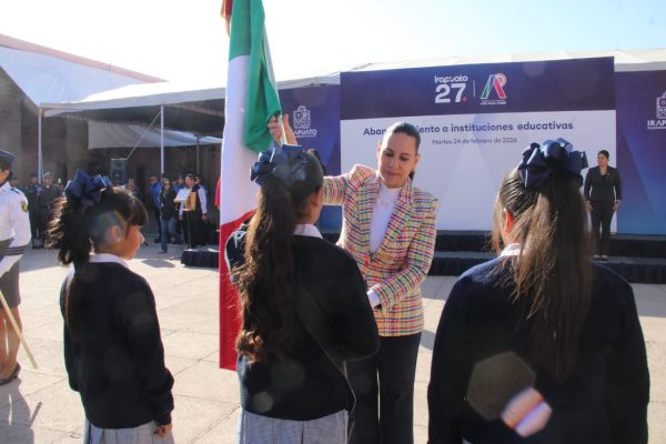 Autoridades del Gobierno de Irapuato llevó a cabo el abanderamiento de 43 escoltas de instituciones educativas, además de guardar un minuto de silencio en memoria de las y los elementos de seguridad que perdieron la vida en el cumplimiento de su deber este domingo 22 de febrero, al defender a la patria ante la situación de inseguridad que enfrenta el país. Autoridades municipales, estudiantes y asistentes rindieron homenaje con respeto y solemnidad. Las escoltas que fueron abanderadas, pertenecen a los niveles de preescolar, primaria, secundaria y preparatoria, quienes participaron en una ceremonia realizada en el patio de la Presidencia Municipal, en el marco del Día de la Bandera, que se celebra este 24 de febrero. Durante su mensaje, la presidenta municipal, Lorena Alfaro, recordó la importancia de que las y los mexicanos se mantengan unidos y trabajen en conjunto por el bienestar común. Por su parte, Joyce Guerrero Barajas, directora de Educación y Juventudes, destacó que estas acciones buscan fortalecer los valores cívicos y fomentar en las y los estudiantes el respeto y amor por la patria, así como transmitir ese mensaje a sus familias y amistades. Con este tipo de ceremonias, el Gobierno Municipal refrenda su compromiso con la formación integral de la niñez y la juventud, promoviendo valores que contribuyan a una sociedad más unida y participativa en Irapuato, en cumplimiento de los objetivos del Plan de Gobierno y de la Estrategia Irapuato 27.
