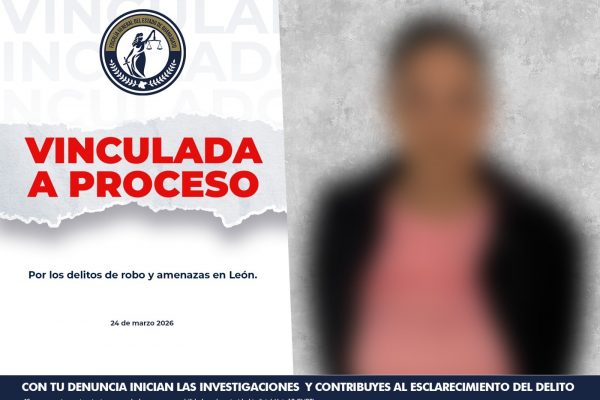 La Fiscalía General del Estado de Guanajuato logró la vinculación a proceso de MA. DEL REFUGIO «N» por su probable responsabilidad en los delitos de robo y amenazas en agravio de tres personas en la ciudad de León. Los hechos ocurrieron el 12 de enero de 2026 al interior de una Parroquia ubicada en la colonia San Nicolás, donde la imputada ingresó y mediante gritos y amenazas exigió dinero a un grupo de personas de la tercera edad, logrando que una de las víctimas le entregara dinero en efectivo. Tras llevarse a cabo la audiencia inicial por cita, el Juez de Control determinó que existen elementos suficientes para continuar el proceso penal en contra de la imputada por el delito de robo cometido contra una víctima y por amenazas contra los tres ofendidos. Como parte de la resolución, se impusieron medidas cautelares que prohíben a la imputada acercarse a las víctimas o al centro religioso donde sucedieron los hechos, otorgando además un plazo de dos meses para el cierre de la investigación complementaria.
