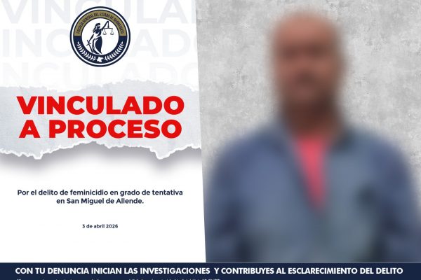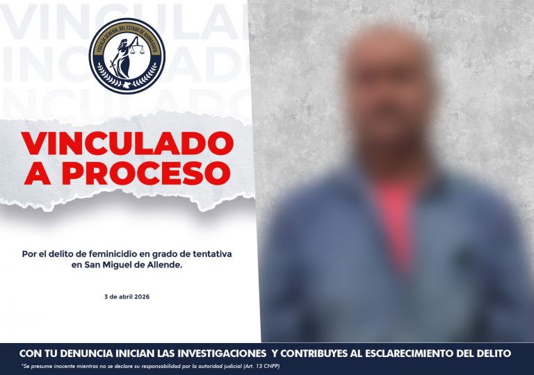 La Fiscalía General del Estado de Guanajuato acreditó ante el Juez de Control la posible responsabilidad de JUAN “N” por el delito de feminicidio en grado de tentativa en el municipio de San Miguel de Allende. De acuerdo a la investigación, aproximadamente a las 11:00 horas del 22 de marzo de 2026, en un inmueble ubicado en la localidad de San Martin del Paredón, JUAN “N” comenzó a ofender a la víctima y luego la amenazó de muerte. Posteriormente, cerca de las 18:00 horas del mismo día, la ofendida ingresó al baño hasta donde JUAN “N” la siguió y comenzó a agredirla brutalmente a golpes. Luego intentó asfixiarla tapando sus vías respiratorias con las manos, hasta que intervino una persona que se percató de la situación. La agente del Ministerio Público al tomar conocimiento del hecho, recabó las pruebas necesarias y solicitó al Juez de Control la orden de aprehensión que permitió detener al presunto agresor y llevarlo ante la autoridad jurisdiccional. En audiencia, la Fiscalía formuló imputación y se dictó auto de vinculación a proceso penal por el delito de feminicidio en grado de tentativa en contra de JUAN “N”. También se impuso al imputado la medida cautelar de prisión preventiva por el tiempo que dure el proceso, así como un plazo para el cierre de investigación complementaria. En la Fiscalía reafirmamos nuestro compromiso para una sociedad más justa, en la que la dignidad humana sea el eje rector de cada una de nuestras acciones, garantizando a las mujeres una vida libre de violencia