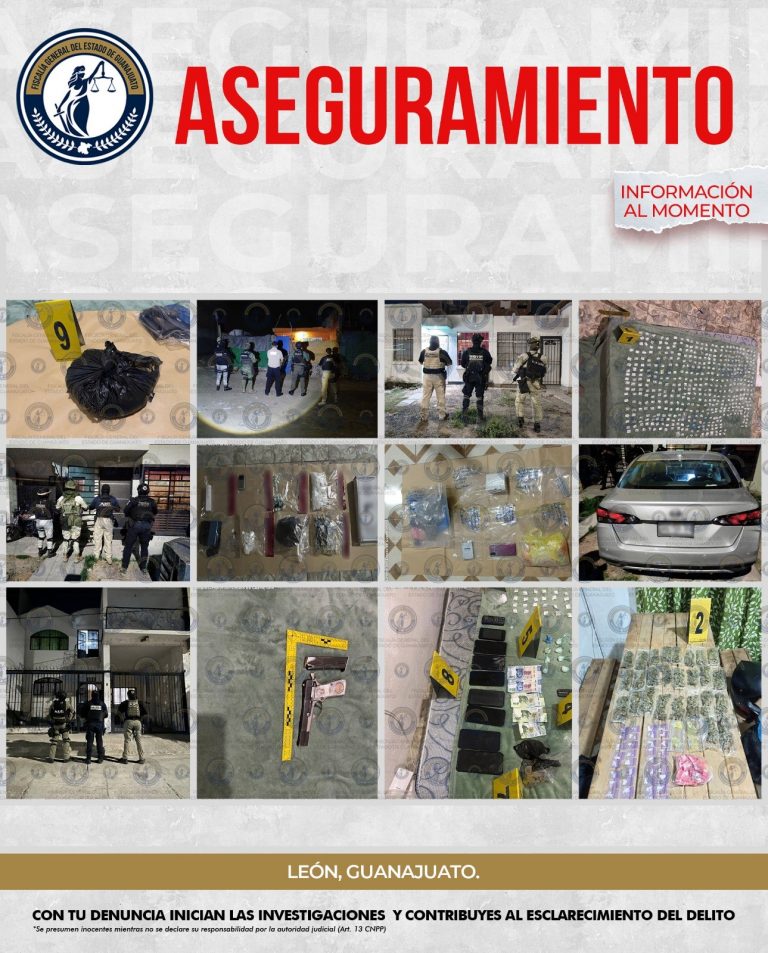 La Fiscalía General del Estado de Guanajuato informa que, como resultado del fortalecimiento de las acciones de investigación impulsadas por denuncias anónimas, se llevaron a cabo operativos simultáneos en la ciudad de León, reafirmando el compromiso institucional de combatir la delincuencia y procurar justicia para la población guanajuatense. A través de la Fiscalía Regional “A”, y en coordinación con la Secretaría de Seguridad y Paz del Estado de Guanajuato y la Secretaría de la Defensa Nacional, durante la madrugada de este sábado se ejecutaron cuatro cateos en las colonias Flores Magón, Villa Esmeralda, Brisas del Campestre y San José de la Joya. Estas acciones operativas, sustentadas en información proporcionada de manera confidencial por la ciudadanía, permitieron obtener los siguientes aseguramientos: 521 envoltorios tipo Ziploc con aproximadamente 300 gramos de metanfetamina 2 básculas grameras 1 arma de fuego tipo pistola calibre 9 mm, con cargador y cartucho útil 56 envoltorios tipo Ziploc y una bolsa plástica con aproximadamente 50 gramos de cocaína Diverso numerario 11 teléfonos celulares 550 gramos de marihuana 1 vehículo 3 envoltorios con 16 gramos de cocaína 1 cargador metálico calibre 9 mm 1 motocicleta alterada sin placas de circulación Asimismo, en uno de los inmuebles intervenidos se cumplimentó una orden de aprehensión por el delito de homicidio, lo que representa un avance significativo en el esclarecimiento de hechos delictivos. Como resultado del operativo, fueron detenidas siete personas, cuya situación jurídica será determinada conforme a derecho. La Fiscalía General del Estado reitera que la participación ciudadana, a través de la denuncia anónima, es fundamental para el desarrollo de este tipo de acciones. Gracias a esta colaboración, es posible dirigir esfuerzos de manera estratégica y efectiva. La institución refrenda su compromiso de continuar trabajando de manera intensa, coordinada y permanente, con el objetivo de garantizar el acceso a la justicia y fortalecer la seguridad en beneficio de todas y todos los guanajuatenses. ¡Actúa ya! Utiliza nuestros canales oficiales: • 📞 800 DNUNCIA (368 62 42) • 📱 ProcurApp (Disponible en iOS y Android) • 🌐 Portal Web de la Fiscalía General del Estado • 💬 Mensaje de texto al 473 172 4444 • 🏢 Agencia del Ministerio Público más cercana.