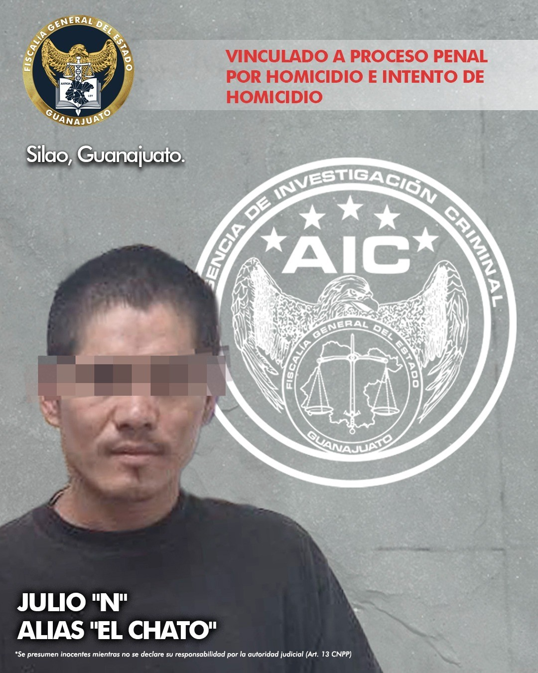 Silao, Gto. 14 de mayo de 2024.- JULIO “N” alias “El Chato” ha sido detenido con orden de aprehensión por Agentes de Investigación Criminal, acusado de disparar contra dos hombres en la comunidad Bajío de Bonillas; agresión donde falleció una víctima y otra sobrevivió.