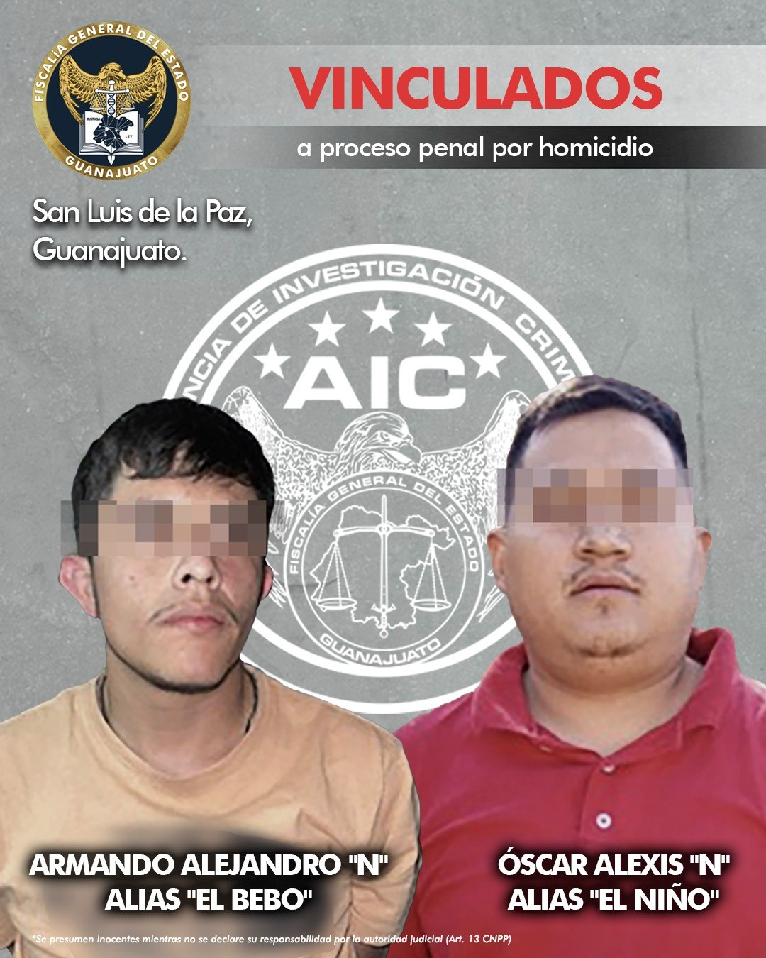 San Luis de la Paz, Gto. 22 de octubre de 2024.- Como presuntos responsables del asesinato de un hombre, fueron capturados ÓSCAR ALEXIS “N” alias “El Bebo” y ARMANDO ALEJANDRO “N” alias “El Niño”. La Fiscalía de Guanajuato obtuvo que fueran vinculados a proceso penal con prisión preventiva como medida cautelar.
