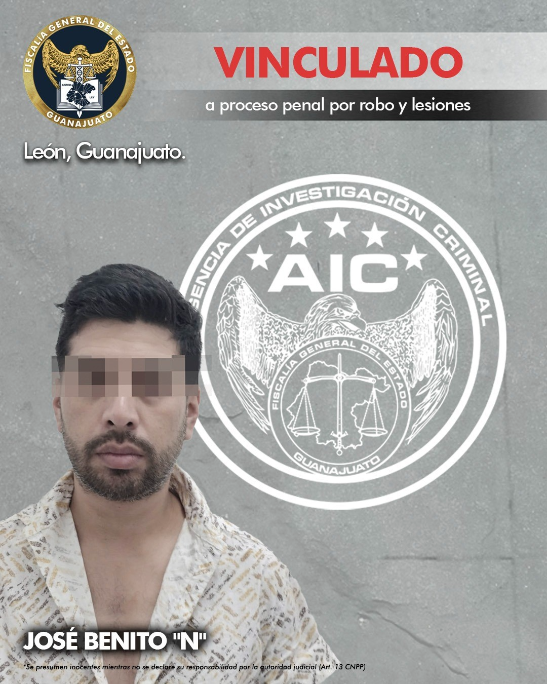 León, Gto. 15 de noviembre de 2024.- Acusado de robo y lesiones, JOSÉ BENITO “N” fue vinculado a proceso penal. La Fiscalía de Guanajuato acreditó la probable responsabilidad de este sujeto, en los hechos registrados el 11 de noviembre de 2024 en la ciudad de León.