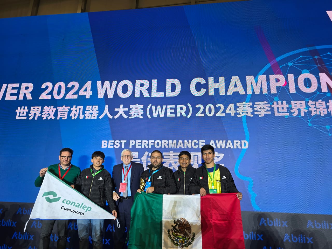 Silao, Guanajuato, 16 de diciembre de 2024. El equipo ROBOCON del Plantel CONALEP Silao conquistó el escenario internacional al obtener el 1er. Lugar Mundial en el Torneo de Robótica WER 2024 WORLD CHAMPIONSHIP, celebrado el pasado 14 de diciembre en el Centro Nacional de Exposiciones de Shanghái, China. Este gran logro posiciona a Aaron Zuriel Belman Hernández, Ángel René Caudillo Palacios, Jesús Martín Bonilla García, estudiantes de 5º semestre de la carrera de Mecatrónica, y a su coach el Prof. Edgar Iván Hernández Rodríguez, como máximos exponentes de la robótica educativa a nivel mundial.