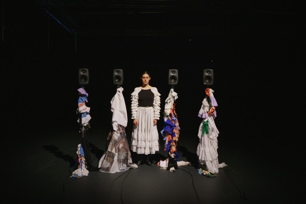 Acompañada del compositor Peter Rubel y una abundancia de altavoces, aborda la poética de construir, deshacer, repetir, modular, interrumpir y abandonar bailes y canciones.