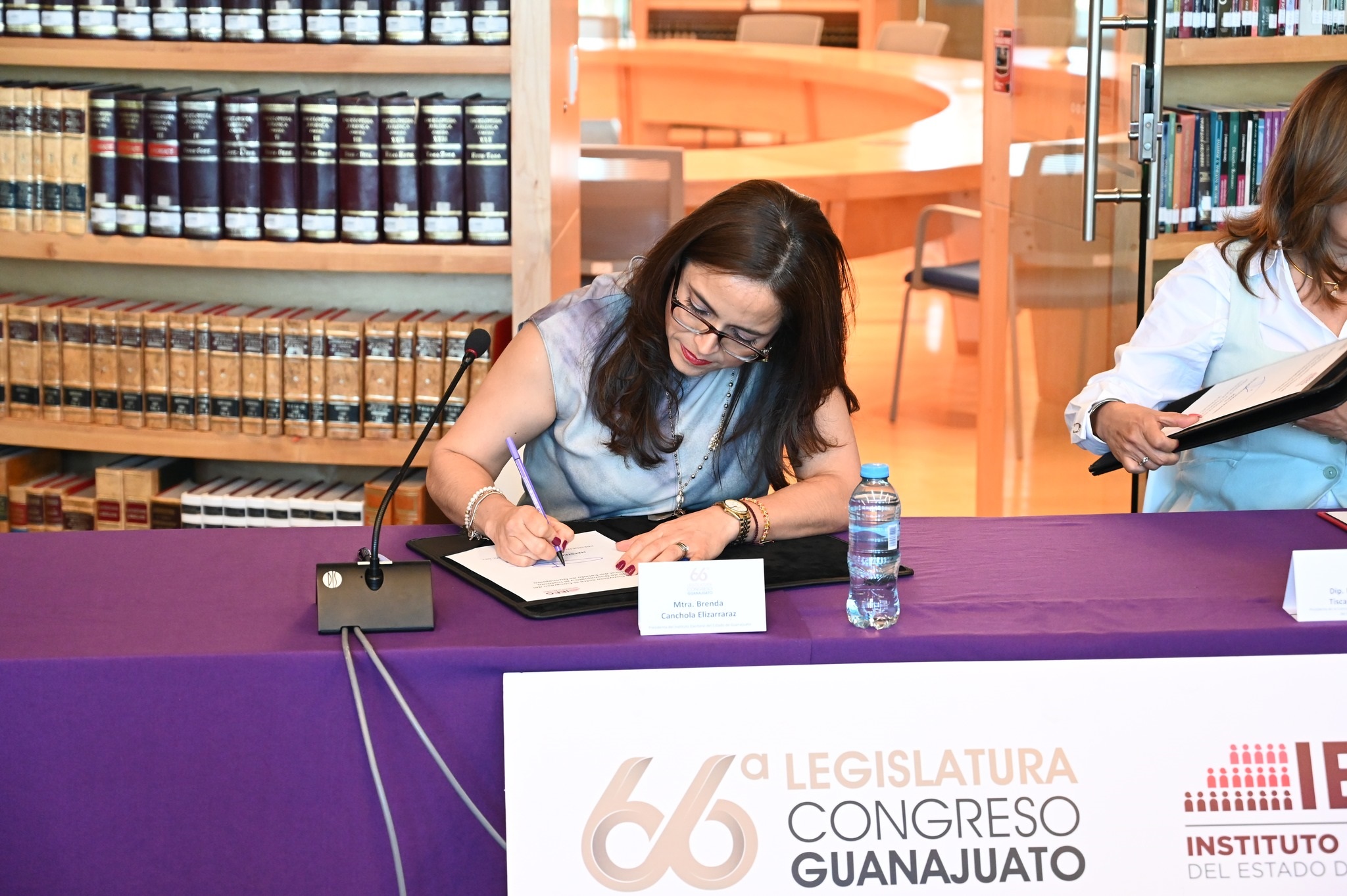 Suscribieron el convenio por parte del IEEG, la consejera presidenta, Brenda Canchola Elizarraraz y la secretaria ejecutiva, Indira Rodríguez Ramírez; por el Congreso del Estado de Guanajuato firmaron la diputada local en representación de la presidencia, Ruth Noemí Tiscareño Agoitia; el diputado local Rodrigo González Zaragoza; y el secretario general, Javier Torres Mereles.