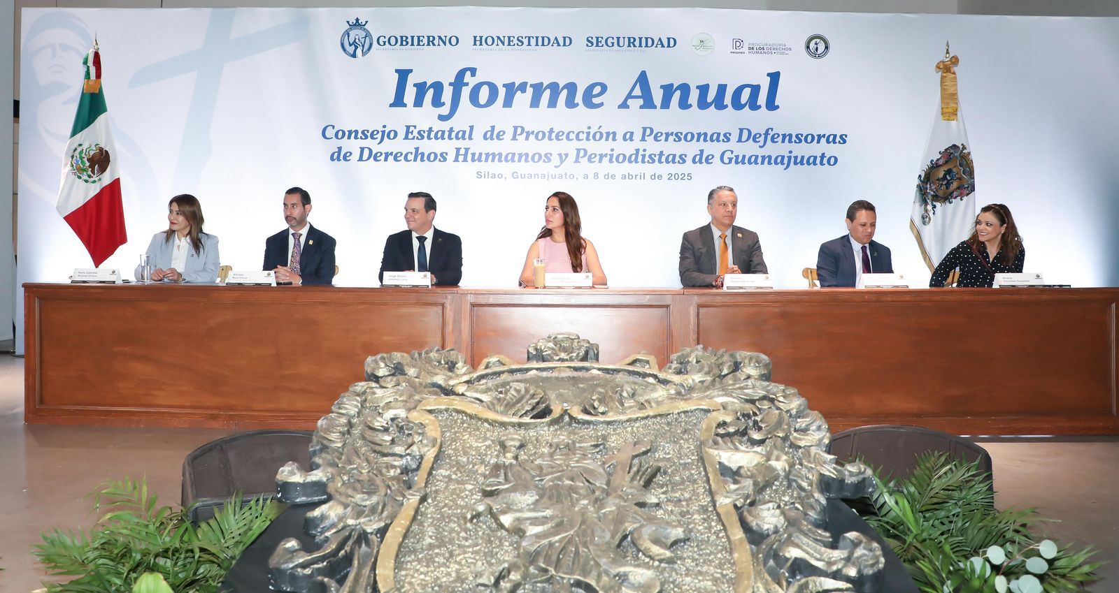 Silao, Gto. 08 de abril de 2025.- El compromiso del Gobierno de la Gente es garantizar la seguridad de las personas defensoras de los derechos humanos, así como la libertad de expresión, “un requisito indispensable en toda democracia”, dijo la Gobernadora de Guanajuato, Libia Dennise García Muñoz Ledo, en el Informe Anual del Consejo Estatal de Protección a Personas Defensoras de Derechos Humanos y Periodistas de Guanajuato.