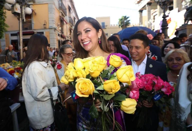 Guanajuato, Gto. 11 de abril de 2025.- La Gobernadora de la Gente, Libia Dennise García Muñoz Ledo, en compañía del Presidente del DIF Estatal, Juan Carlos Montesinos Carranza, participaron esta mañana en los festejos tradicionales por el Día de las Flores y Viernes de Dolores, obsequiando flores a la gente por el centro histórico de la Capital.