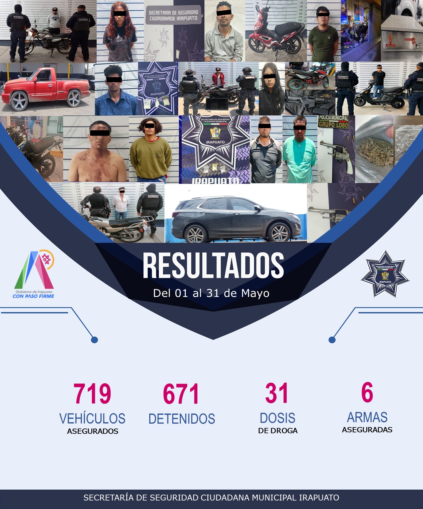 Irapuato, Gto. 02 de junio de 2025. – Con la finalidad de generar espacios de sana convivencia que contribuyan al desarrollo de un Irapuato confiable y feliz, así como mantener el orden y la paz pública, el Gobierno Municipal implementó acciones de prevención y seguridad con resultados favorables durante el mes de mayo.