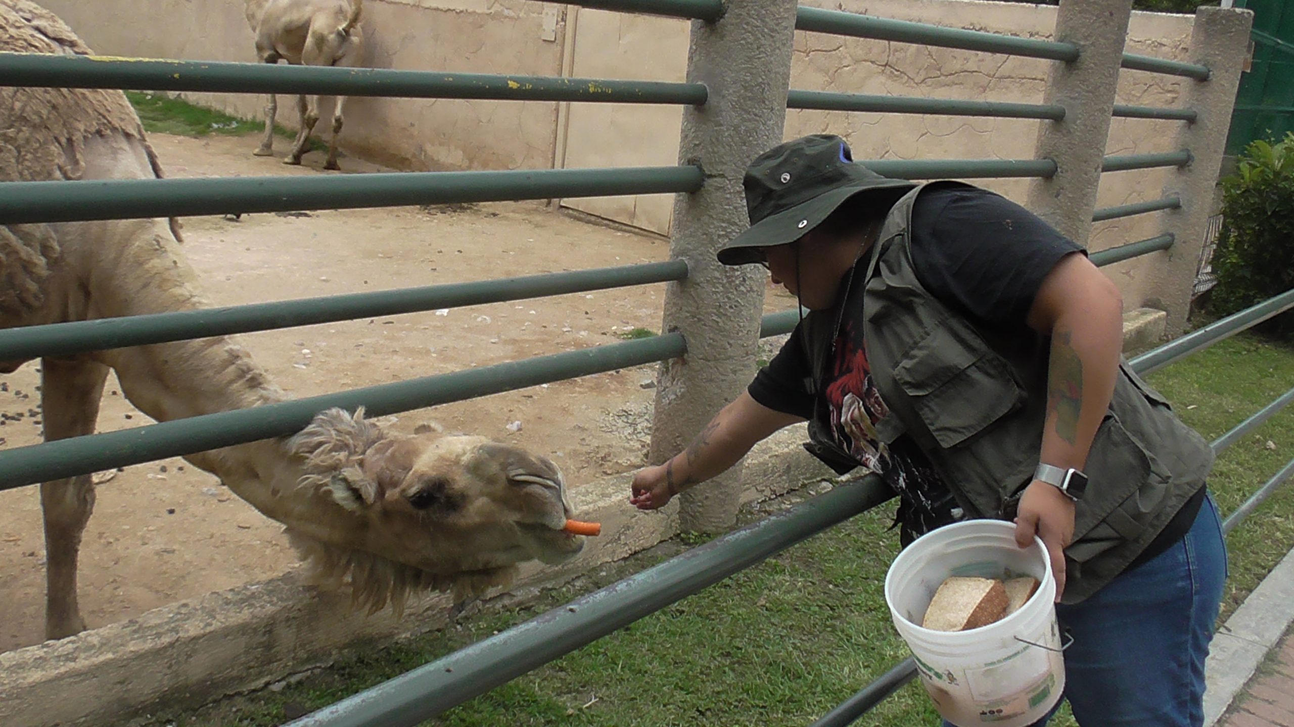 “Nos encontramos con estos bonitos ejemplares, estos son dromedarios: ‘Galilea’ nuestra hembra y el macho que se llama ‘Cuauhtémoc’; ellos son familiares del camello y de las llamas. Contrario a la creencia popular, el dromedario es el que tiene una sola joroba y el camello tiene dos jorobas, a la que se le llama jiba”, señaló la doctora Gaby, del ZooIra.