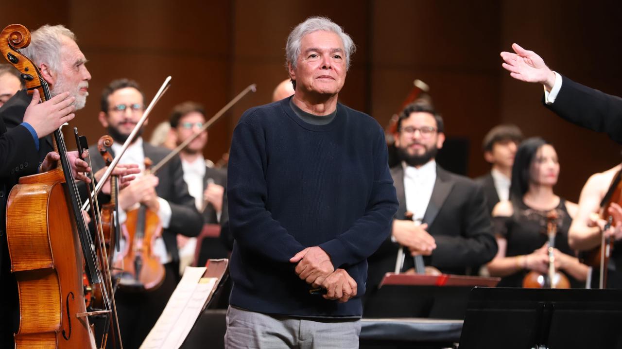Guanajuato, Gto., a 06 de septiembre de 2025.- En el marco de la Universiada Cervantina 2025, la Orquesta Sinfónica de la Universidad de Guanajuato (OSUG) y su director, Juan Carlos Lomónaco, rindieron un magno homenaje al compositor mexicano Arturo Márquez por su 75 aniversario. Durante el concierto en el Teatro Juárez y con la presencia del artista, se estrenó en Guanajuato su obra Espejos en la arena, con el joven violonchelista Miguel Ángel Villeda.