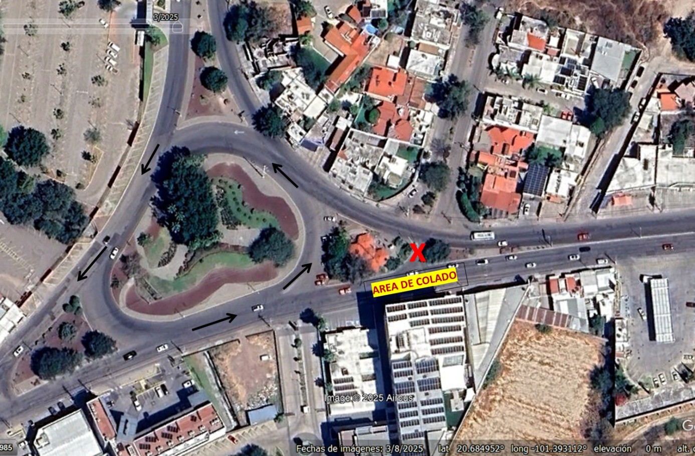 La subida, localizada frente al Hotel Concordia (pasando la glorieta), permanecerá cerrada para quienes circulen desde Cuchicuato o desciendan de Villas de Irapuato con intención de ingresar al fraccionamiento, ya que el acceso será intervenido para la aplicación del nuevo pavimento.