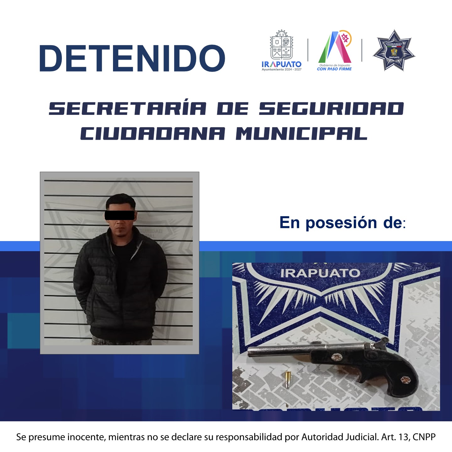 Irapuato,Gto., a 28 de septiembre de 2025.- Durante recorridos de inspección y vigilancia que implementa la Secretaría de Seguridad Ciudadana en los diferentes sectores del municipio, integrantes de la Policía Municipal detuvieron a un individuo por el delito de portación de arma de fuego.