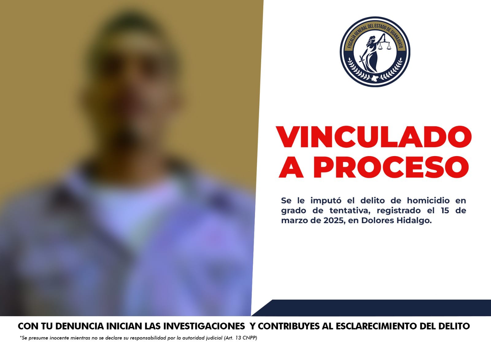 La Fiscalía General del Estado, a través del Ministerio Público, obtuvo la vinculación a proceso de JULIO CÉSAR “N” por su probable participación en el delito de homicidio en grado de tentativa, en agravio de personas que viajaban a bordo de un vehículo en Dolores Hidalgo.