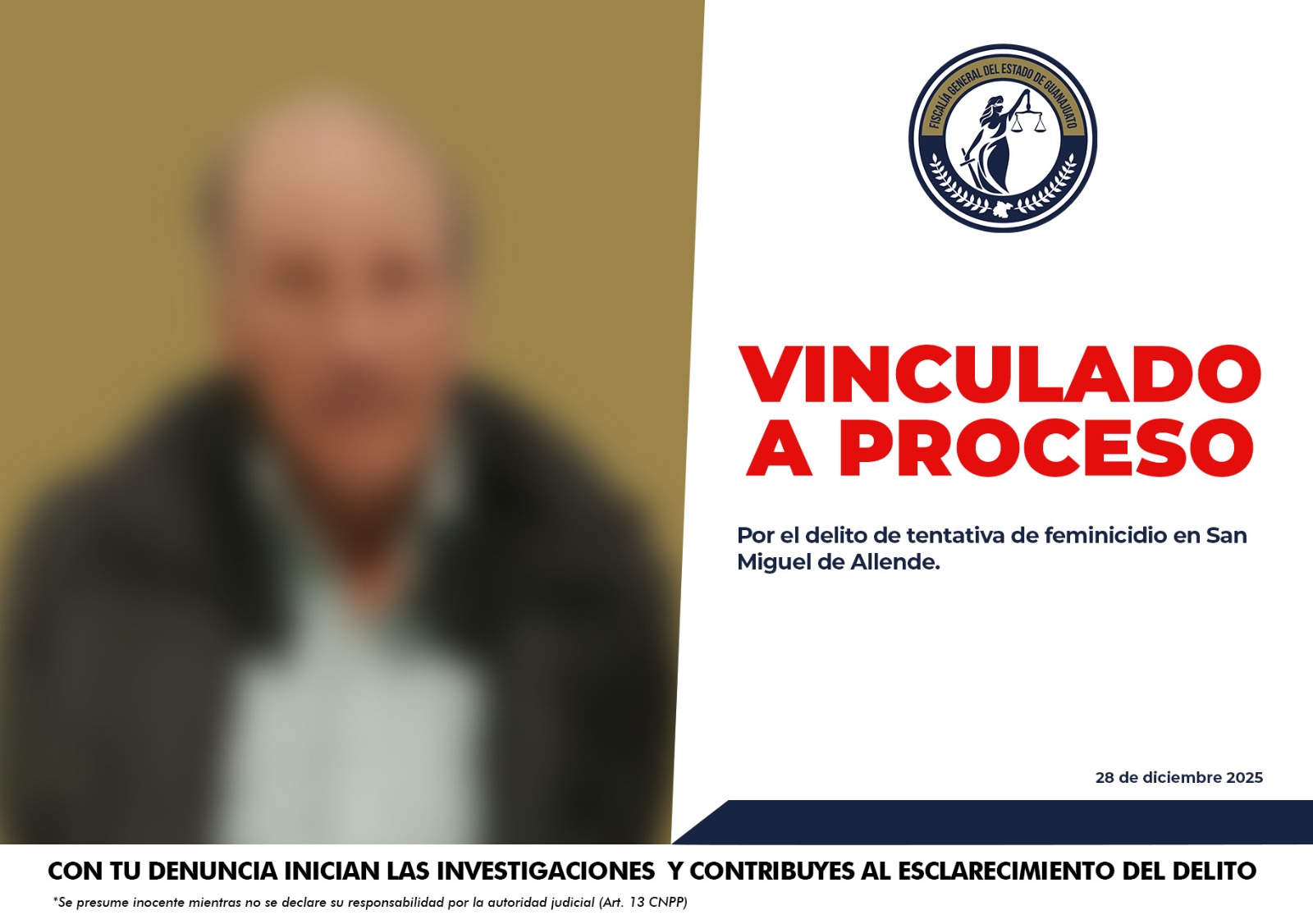 La Fiscalía General del Estado de Guanajuato ha logrado la vinculación a proceso de GERARDO “N”, como presunto responsable del delito de feminicidio en grado de tentativa, tras los hechos violentos registrados el pasado 25 de diciembre de 2025 en la comunidad Puente del Carmen, en San Miguel de Allende.