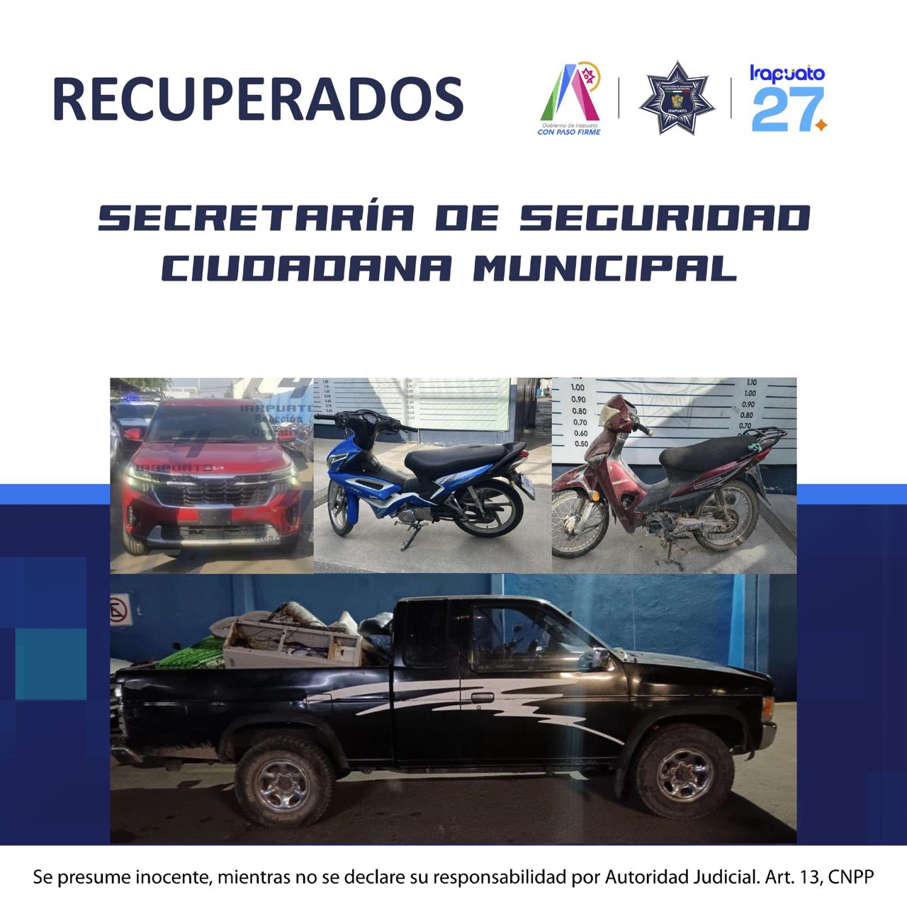 Irapuato, Gto., a 1 de enero de 2026.– Como resultado de los patrullajes preventivos, el uso de tecnología y la atención oportuna a reportes ciudadanos, la Policía Municipal de Irapuato logró la recuperación de dos camionetas y dos motocicletas con reporte de robo, así como la detención de cuatro personas, en distintos puntos del municipio.