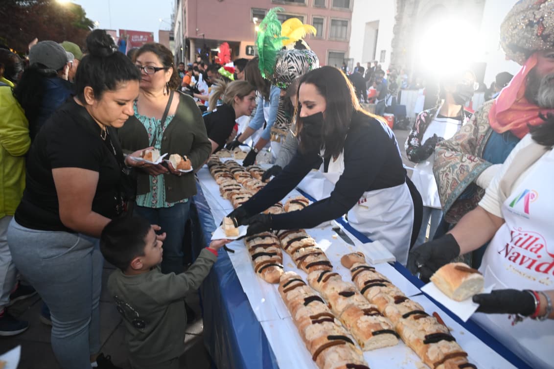 La tradicional Rosca de Reyes fue entregada junto a chocolate caliente, para que las y los asistentes disfrutaran de un agradable momento en el Centro Histórico de la Ciudad; este pan dulce contó con un total de 2 mil Niños Dios.