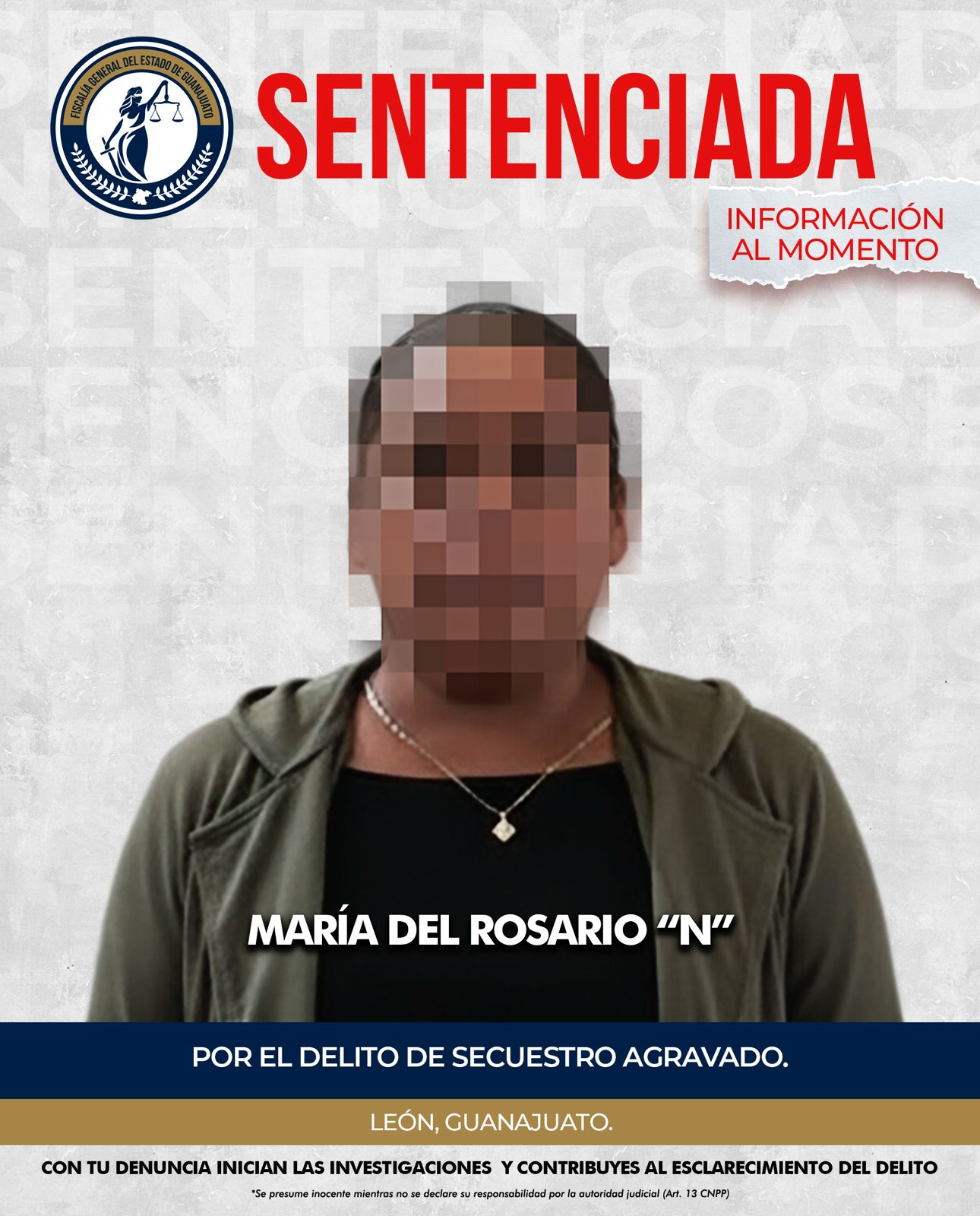 La Fiscalía General del Estado de Guanajuato obtuvo una sentencia condenatoria de 60 años de prisión en contra de MARÍA DEL ROSARIO “N”, al acreditarse plenamente su responsabilidad penal en el delito de secuestro agravado, cometido en perjuicio de una madre y sus dos hijos menores de edad.