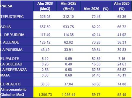 Guanajuato, Gto a 13 de abril de 2026.- De acuerdo con el reporte hidrometeorológico de la Secretaría del Agua y Medio Ambiente (SAMA), las principales presas de la entidad presentan un porcentaje promedio de almacenamiento 69.8 por ciento, al registrar 1306.7 millones de metros cúbicos.