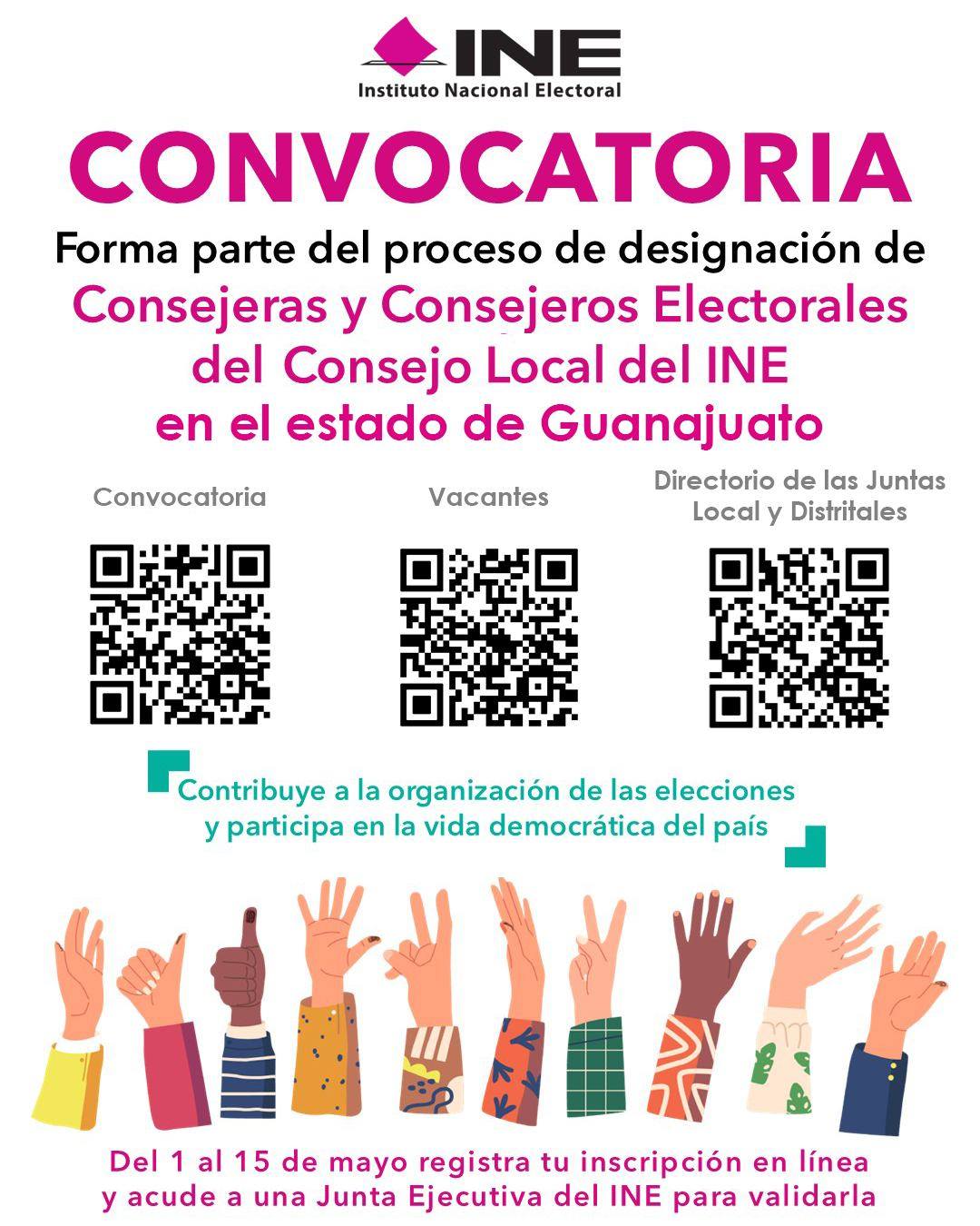El Instituto Nacional Electoral (INE) en el Estado de Guanajuato invita a la ciudadanía interesada en participar en el proceso de selección para ocupar las vacantes de Consejeras o Consejeros Electorales en el Consejo Local para los próximos Procesos Electorales.