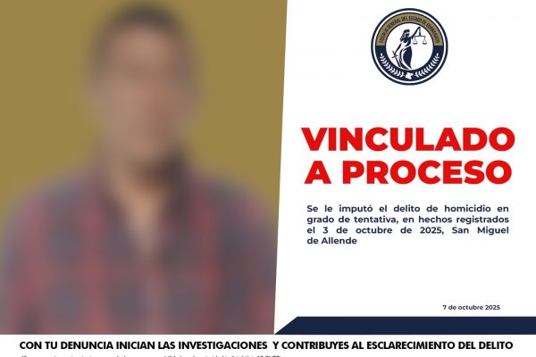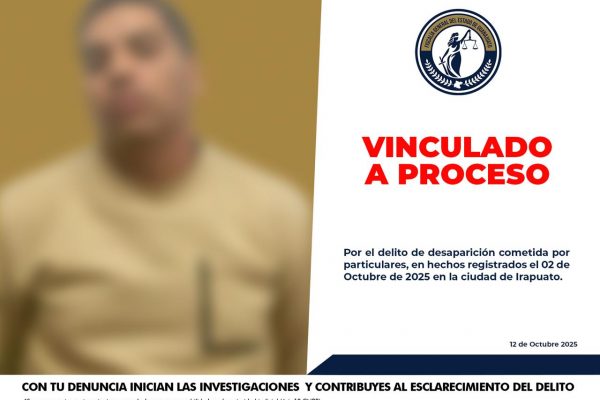 Por el delito de desaparición cometida por particulares en Irapuato La Fiscalía General del Estado de Guanajuato, informa que, en un trabajo coordinado de investigación y con base en elementos sólidos de prueba, se logró la vinculación a proceso de CÉSAR GUADALUPE “N” por su probable participación en el delito de desaparición cometida por particulares, cometido el pasado 2 de octubre en la ciudad de Irapuato. El hecho, comenzó alrededor de las 04:35 horas del 2 de octubre de 2025, cuando la víctima, un hombre que se encontraba en su domicilio ubicado en la colonia Campestre Hurtado, en compañía de su pareja y otros familiares, fue víctima de un brutal acto de violencia. En ese momento, un grupo de sujetos armados, a bordo de una camioneta tipo pick up, irrumpió violentamente en el inmueble. Los agresores, entre los que se encontraba el ahora imputado CÉSAR GUADALUPE “N”, portaban armas de alto calibre. Sin mediar palabra, golpearon a la víctima. Posteriormente, la víctima fue privada de su libertad, siendo abordada a la fuerza en el vehículo de los agresores y desde ese momento, se desconoce su paraderoAnte estos hechos, la Unidad Especializada en Investigación de Personas Desaparecidas de la FGE comenzó con la búsqueda e investigación del caso. Con el apoyo de diversas técnicas y análisis, se logró identificar al presunto responsable y, tras obtener pruebas suficientes, se solicitó ante el juez de control una orden de captura para el imputado CÉSAR GUADALUPE “N”. Tras la presentación de las pruebas, el juez resolvió vincularlo a proceso por el delito de desaparición cometida por particulares. CÉSAR GUADALUPE “N” permanecerá en prisión preventiva mientras continúa el proceso judicial.