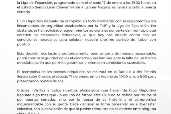 La directiva del Club Deportivo Irapuato informa que será a puertas cerradas el partido que se realizará este sábado esta tarde entre el equipo Irapuato y Leones Negros de la Universidad de Guadalajara , a petición del gobierno municipal de Irapuato. En un comunicado se refiere que la medida obedece a requerimientos adicionales solicitados por el gobierno municipal los cuales asegura la directiva que rebasan los estándares establecidos por las autoridades, situación derivó en la determinación de no permitir acceso al público. El comunicado sin embargo no refiere los antecedentes de violencia que se han suscitado recientemente entre simpatizantes de la Trinca y de los equipos contrincantes.