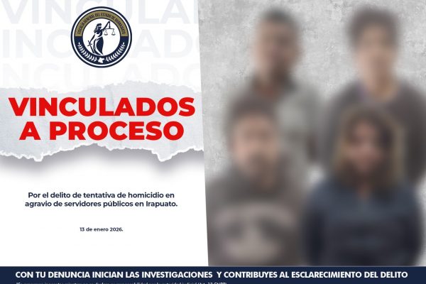 El trabajo de investigación, inteligencia y actuación oportuna de la Fiscalía General del Estado de Guanajuato permitió neutralizar a un generador de violencia y desarticular una célula delictiva, luego de un ataque armado perpetrado contra personal ministerial durante el cumplimiento de una orden judicial en el municipio de Irapuato. La tarde del 30 de diciembre de 2025, un equipo integrado por un agente del Ministerio Público, peritos y agentes de Investigación Criminal acudió a un domicilio para ejecutar un cateo autorizado por un juez, como parte de una investigación dirigida a reducir la incidencia delictiva y proteger a la población. Al arribar al inmueble, los servidores públicos fueron agredidos con disparos de arma de fuego de alto poder, realizados desde el interior del lugar. Gracias a la reacción profesional, coordinada y apegada a derecho de los agentes, la agresión fue contenida sin que se registraran víctimas mortales, logrando la detención del atacante, identificado como FERNANDO “N”, señalado como líder de un grupo criminal con origen en un estado vecino y considerado objetivo prioritario por su presunta participación en hechos de alto impacto en la región. Durante su captura, se le aseguró un arma de fuego, cargadores abastecidos, metanfetamina y dinero en efectivo, elementos que fortalecen las líneas de investigación en su contra. En el mismo operativo fueron detenidos CARLOS IGNACIO “N”, MARÍA DE LOS ÁNGELES “N” y LEONARDO “N”, a quienes también se les encontraron sustancias ilícitas. Las indagatorias preliminares los vinculan con diversos eventos delictivos recientes que afectaron la tranquilidad de las familias de Irapuato. Los cuatro detenidos fueron puestos a disposición de la autoridad judicial, y el Juez de Control calificó como legales las detenciones, dictando auto de vinculación a proceso penal por el delito de tentativa de homicidio en agravio de servidores públicos, así como por los delitos federales de posesión de un arma de fuego de uso exclusivo del ejército, armada y fuerza aérea, posesión de cargadores para armas de fuego de uso exclusivo del ejército, armada y fuerza aérea, y posesión de metanfetamina imponiendo como medida cautelar la prisión preventiva. La autoridad judicial otorgó un plazo para el cierre de la investigación complementaria, periodo en el que la Fiscalía reforzará los elementos probatorios para garantizar que los responsables enfrenten una sentencia conforme a la ley. Con estas acciones, la Fiscalía General del Estado de Guanajuato reafirma su compromiso con la sociedad, actuando con firmeza contra quienes atentan contra la seguridad y la vida, y respaldando a las y los servidores públicos que, con profesionalismo y vocación, trabajan todos los días para proteger a las familias guanajuatenses y fortalecer el Estado de Derecho.