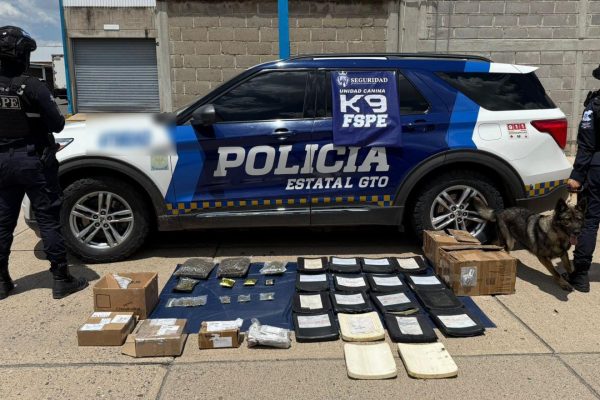 El binomio K9 detectó siete paquetes con más de mil 200 dosis de presunta marihuana y 18 placas balísticas en una empresa ubicada en la colonia Bugambilias. Los envíos tenían como remitentes y destinatarios a distintas personas de Guanajuato y otras entidades. León, Gto., a 05 de septiembre de 2025.- La Secretaría de Seguridad y Paz del Estado de Guanajuato, a través de la Unidad Canina K9 de las Fuerzas de Seguridad Pública del Estado (FSPE), frustró en León el traslado de narcóticos y equipo táctico que pretendían enviarse mediante una empresa de paquetería. Esta acción se dio en el marco de la estrategia estatal CONFIA (Coordinación Operativa de la Nueva Fuerza de Inteligencia Anticrimen) y como parte de las acciones permanentes contra el narcomenudeo, durante una inspección realizada en la bodega de una empresa ubicada en el bulevar La Luz, colonia Bugambilias. En el sitio, el oficial canino Oxi marcó de manera positiva siete paquetes, en cuyo interior fueron localizadas 1 mil 253 dosis de posible marihuana distribuidas en diversos envoltorios, así como 18 placas balísticas de uso exclusivo de instituciones de seguridad y Fuerzas Armadas. Las guías de envío mostraban distintos remitentes y destinatarios en ciudades como León, Irapuato, Pénjamo, Dolores Hidalgo, Guadalajara, Morelia, Aguascalientes y Ciudad de México, lo que confirmó un intento de distribución ilegal en rutas interestatales. Todo lo asegurado fue puesto a disposición del Ministerio Público del fuero común en León, con la debida integración de la cadena de custodia. La Secretaría de Seguridad y Paz refrendó su compromiso de impedir que drogas y equipo táctico lleguen a las calles, a fin de proteger la seguridad de las familias guanajuatenses y debilitar las operaciones de los grupos criminales. Asimismo, la dependencia estatal reiteró el llamado a la ciudadanía a denunciar de manera anónima al 089 cualquier hecho delictivo o sospechoso.