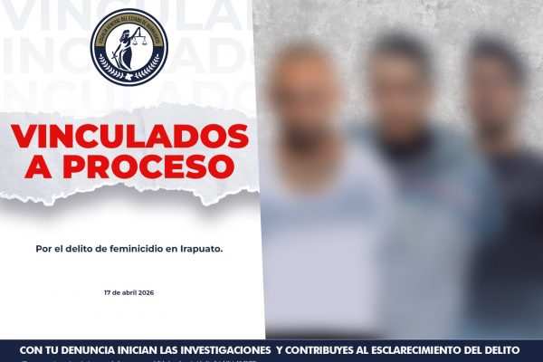 Como parte de las acciones contundentes para combatir y erradicar la violencia contra las mujeres, la Fiscalía General del Estado de Guanajuato obtuvo un auto de vinculación a proceso en contra de DIEGO ARMANDO “N”, JOEL GIBRÁN “N” y GEOVANNI “N”, presuntos responsables del feminicidio de dos mujeres en la ciudad de Irapuato. La investigación dirigida por la Unidad Especializada en Investigación de Homicidios estableció que el pasado viernes 3 de abril de 2026, aproximadamente a las 16:00 horas, las víctimas fueron trasladadas mediante la fuerza a un inmueble de la colonia Barrio de Santa Julia. Lugar donde los agresores privaron de la vida a las víctimas. Posteriormente, durante la madrugada del 4 de abril, los cuerpos fueron abandonados en la colonia Barrio de San José. Gracias al despliegue de trabajo de campo y al minucioso análisis de información, entre otras diligencias realizadas para identificar a los presuntos responsables, se logró obtener de la autoridad judicial las órdenes de aprehensión con las que fueron capturados para ser llevados ante la justicia. En la audiencia correspondiente, la agente del Ministerio Público, presentó los datos de prueba que acreditan la probable participación de los imputados en estos hechos. Tras el análisis del caso, la Juez determinó que los tres sujetos fueran sujetos a proceso penal bajo la medida cautelar de prisión preventiva.