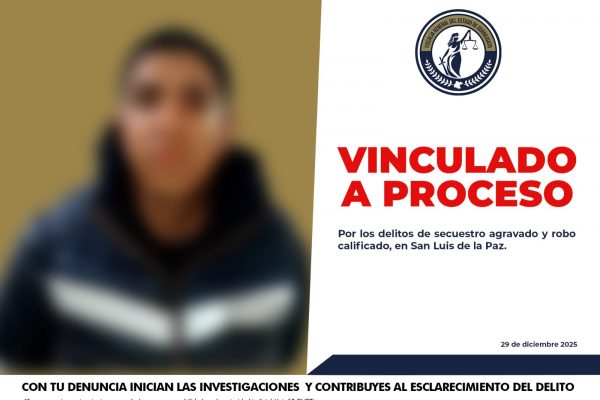 La Fiscalía General del Estado de Guanajuato obtuvo la vinculación a proceso de EDUARDO “N”, por su presunta responsabilidad en los delitos de secuestro agravado y robo calificado, registrados en el municipio de San Luis de la Paz. De acuerdo con la investigación, los hechos ocurrieron la mañana del viernes 19 de diciembre de 2025, cuando el imputado se aproximó a un negocio ubicado sobre el bulevar Sierra Gorda, donde se encontraba la víctima a bordo de una camioneta. Portando un arma de fuego, el agresor amagó a la víctima, la golpeó en la cabeza y la privó de la libertad. Posteriormente, la obligó a permanecer en el vehículo mientras se desplazaban por diversas vialidades, hasta llegar a un tramo de terracería, donde la subió a otro automóvil mientras el imputado huyó en la misma camioneta. Más tarde, sobre la carretera federal 57, a la altura del municipio de San José Iturbide, el vehículo fue localizado en el exterior de una tienda de conveniencia. El propietario reconoció la unidad y dio aviso a elementos de la Guardia Nacional, quienes lograron la detención de EDUARDO “N”. Durante el tiempo que la víctima permaneció privada de la libertad, un familiar recibió exigencias de una cantidad de dinero a cambio de su liberación. Tras la detención del imputado, la víctima fue liberada y resguardada de inmediato por agentes de la Fiscalía General del Estado, adscritos a la Unidad Especializada en Combate al Secuestro. Con los datos de prueba presentados por el MinisterioPúblico, un Juez de Control resolvió vincular a proceso a EDUARDO “N”, imponiendo la medida cautelar de prisión preventiva mientras se lleva a cabo la investigación complementaria para determinar su responsabilidad penal.