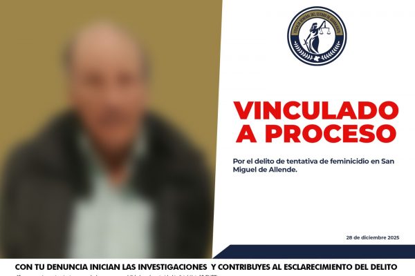 La Fiscalía General del Estado de Guanajuato ha logrado la vinculación a proceso de GERARDO “N”, como presunto responsable del delito de feminicidio en grado de tentativa, tras los hechos violentos registrados el pasado 25 de diciembre de 2025 en la comunidad Puente del Carmen, en San Miguel de Allende. De acuerdo con la investigación conducida por una agente del Ministerio Público, los sucesos ocurrieron entre las 05:30 y 06:00 horas del día de Navidad. El imputado, encontrándose en estado de ebriedad, ingresó de manera alterada a una habitación del domicilio exigiendo un arma de fuego. Tras una discusión de varios minutos, el agresor atacó a la víctima con un cuchillo, provocándole una herida de gravedad en el cuello que puso en peligro su vida. La agresión cesó gracias a la intervención de un familiar, quien logró desarmar al sujeto para que la víctima fuera trasladada de urgencia a un hospital. En la audiencia inicial por orden de aprehensión cumplimentada, el Juez de Control dictó auto de vinculación a proceso en contra de GERARDO “N” por el delito de Feminicidio en grado de tentativa. Para acreditar la probable responsabilidad del imputado, el equipo ministerial y pericial aplicó de manera rigurosa el protocolo de investigación con perspectiva de género, realizando diligencias que incluyeron el procesamiento del lugar de los hechos, el aseguramiento de diversos objetos, peritajes en medicina legal para documentar la naturaleza de las lesiones y dictámenes psicológicos. Como medida cautelar, se impuso la prisión preventiva por todo el tiempo que dure el proceso. Finalmente, se estableció un plazo de tres meses para el cierre de la investigación complementaria.